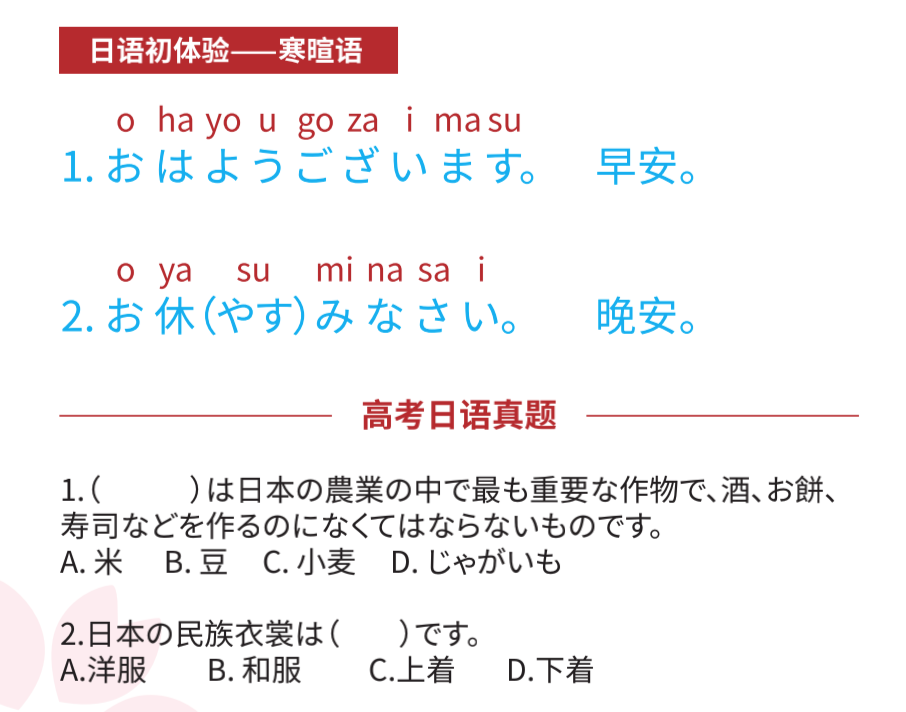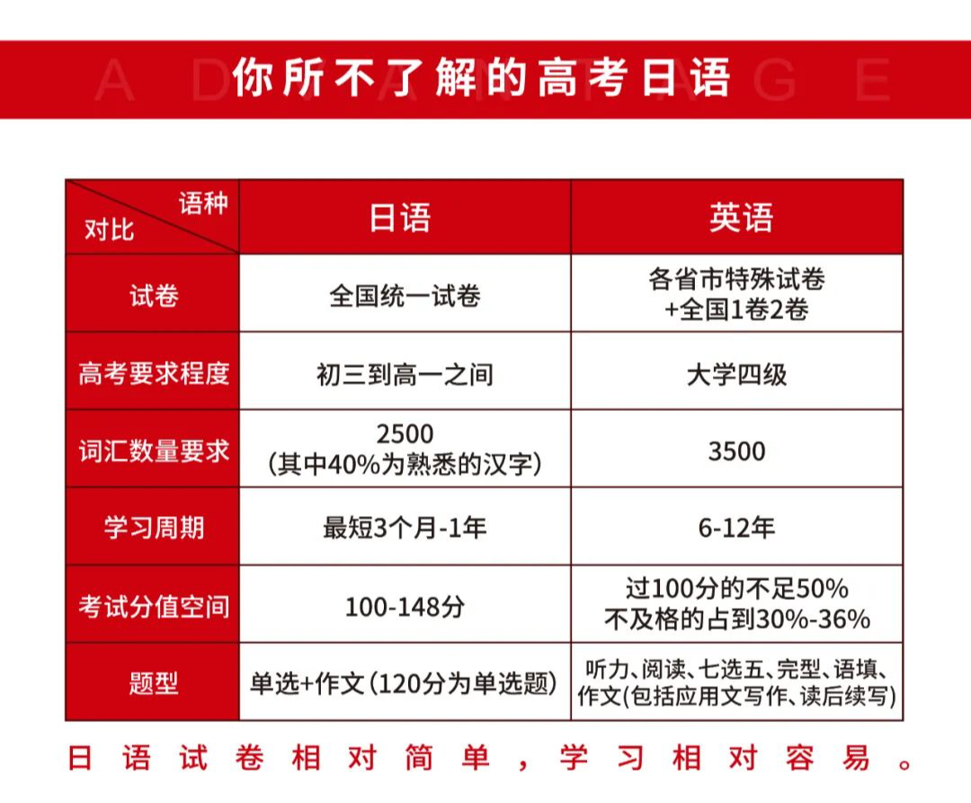 高考日语为全国卷,全国统一命题,题型比较单一,除作文外,全部都是选择题,且题型简单,对考生的词汇量要求比英语要低,另外学习日语时分数提升空间大。