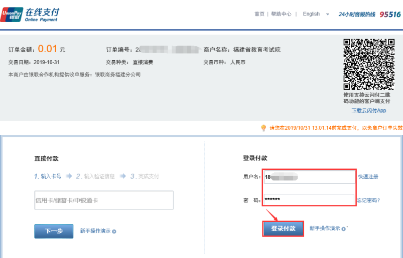 2、银联支付页面提供三种支付方式:“直接付款”、‘登录付款’、‘二维码’;具体操作如下: