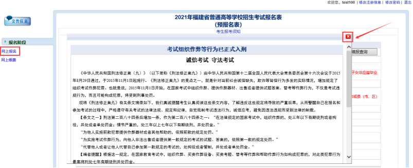 点击左侧功能列表,点击“网上报名”,阅读《考试组织作弊等行为已正式入刑》及《福建省普通高等学校招生考试报名工作通知》,阅读完毕点击右上角【关闭】按钮进行关闭,跳转到网上报名界面。