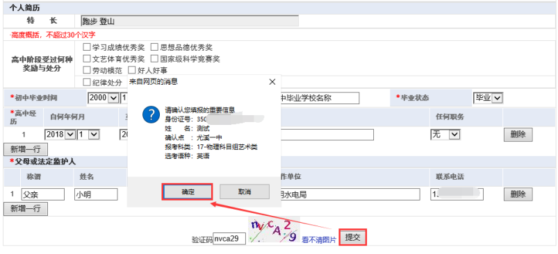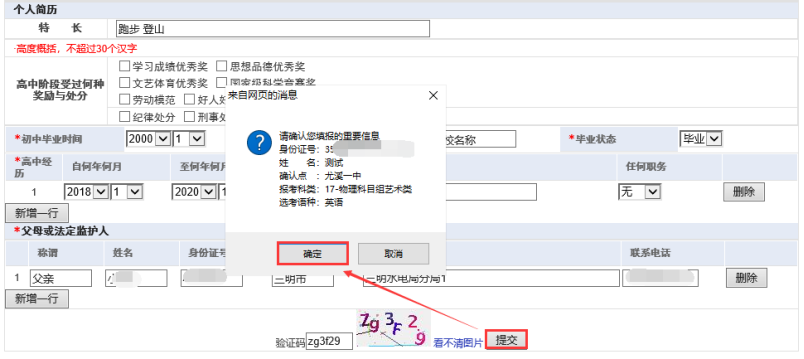 第四步:点击【提交】后,弹出【请确认您填报的重要信息】点击【确定】;