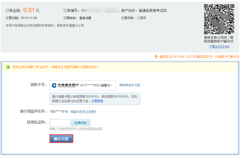 3)二维码:考生可使用支持云闪付二维码功能的客户端扫描二维码进行支付,如云闪付、中国工商银行、工商银行工银融e联、工银e生活、农业银行掌上银行、中国银行手机银行等app进行扫描支付。