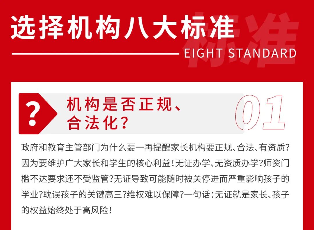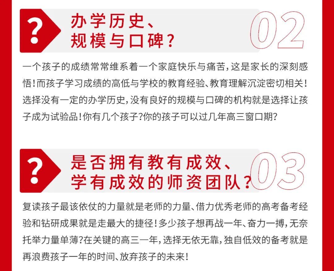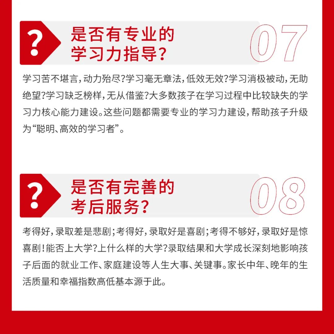 决定复读以后,选择一所靠谱的复读机构也是至关重要的,一所好的能够最大限度的为你助推,为你一年的复读冲刺保驾护航,小编为大家罗列了选择机构的八大标准:
