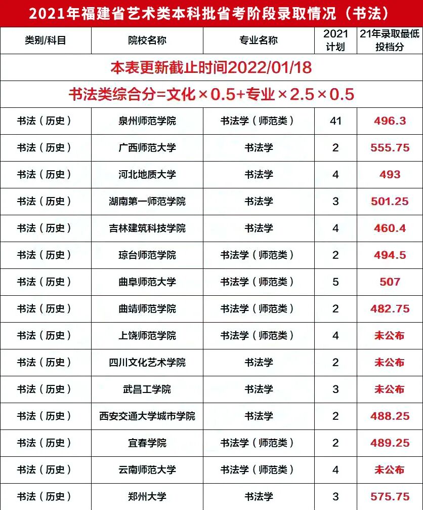 2021年普通高校招生「书法类」录取分数汇总 - 历史组