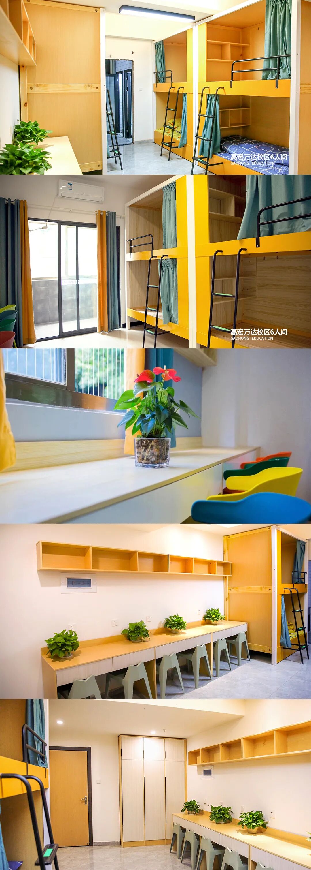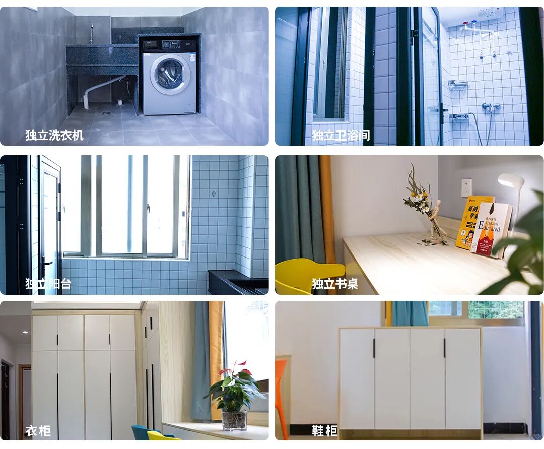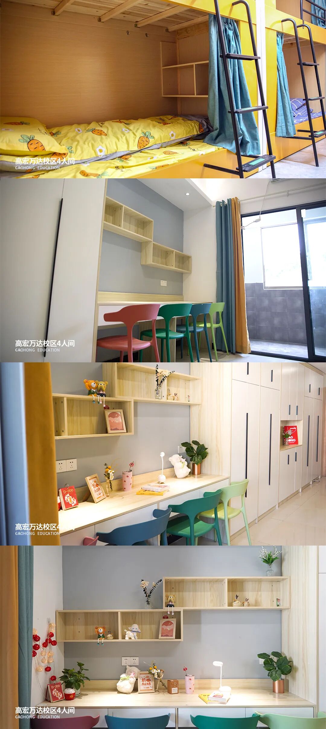 宿舍楼层采用男女分层设计,共有三种房型可选,二人间、四人间和六人间,所有宿舍都有独立阳台,同时宿舍内也配备了衣柜、鞋柜。