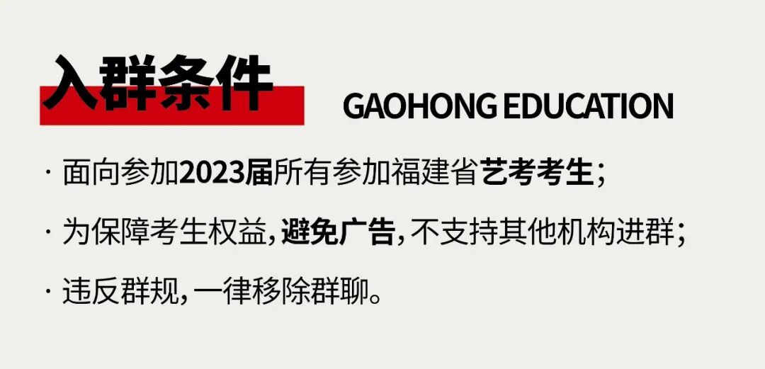 高宏教育联合福建艺考网升学中心,组建“2023届福建艺考学习交流群”。