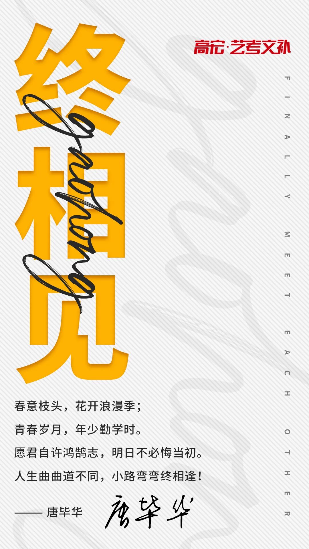 首先欢迎即将步入高宏的孩子们,祝你们现在的体考能取得理想成绩,咱们艺考生也能得到自己想要的成绩。对于你们的到来,我觉得这样一句话非常的适合你们:那么你们面对的是高考这个大关,那么我希望你们能够一腔热血战高考,满腹经纶写人生。