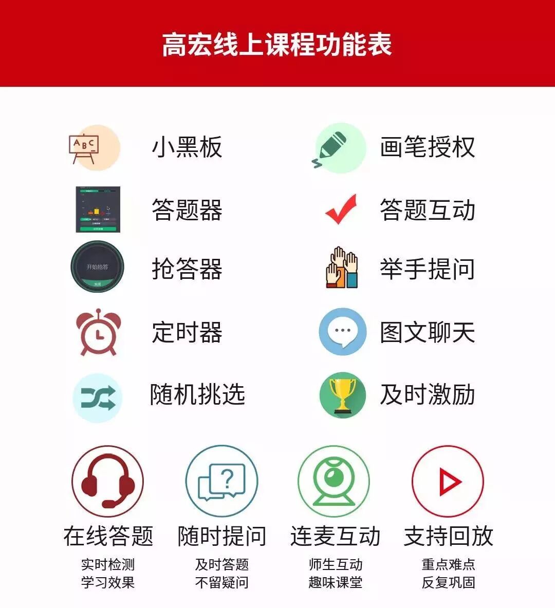 有很多师生互动的功能,如答题器功能,抢答功能,写字板功能,问题留言功能等等。极大丰富了师生之间的互动,最大程度模拟了线下课程的优越方面。让学生有问题能够及时向老师反馈,而教师也能时时了解学生的听课情况。