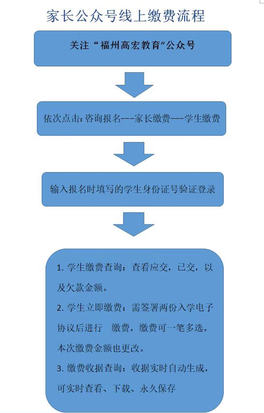 缴费方式:目前已开始预排宿舍、班级等开班准备事宜,现在开始进行学生缴费工作,以学生费用缴纳进行最终确认,各位学生、家长需关注“福州高宏教育”公众号完成线上缴费后,报到现场出示缴费凭证,具体缴费流程如下: