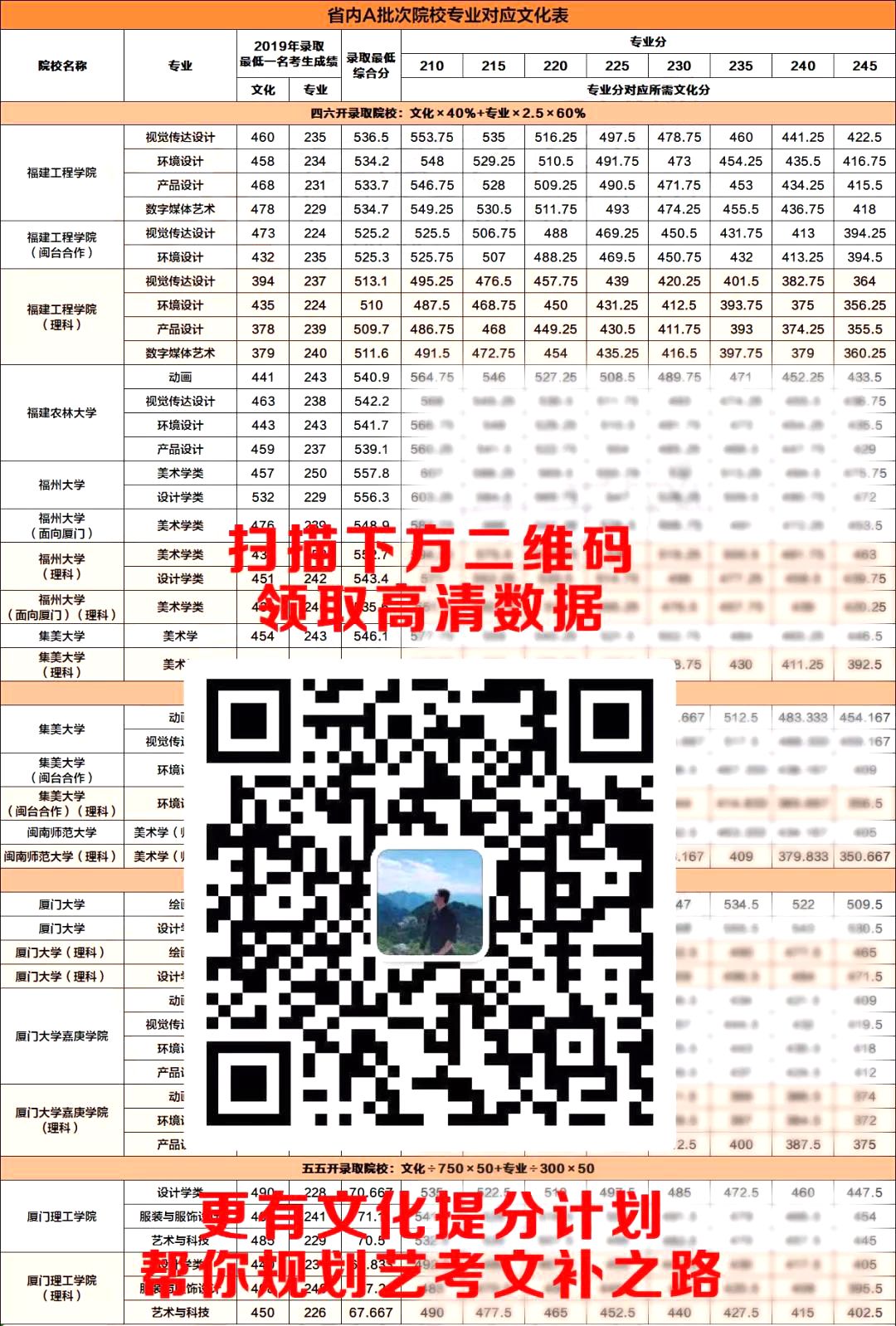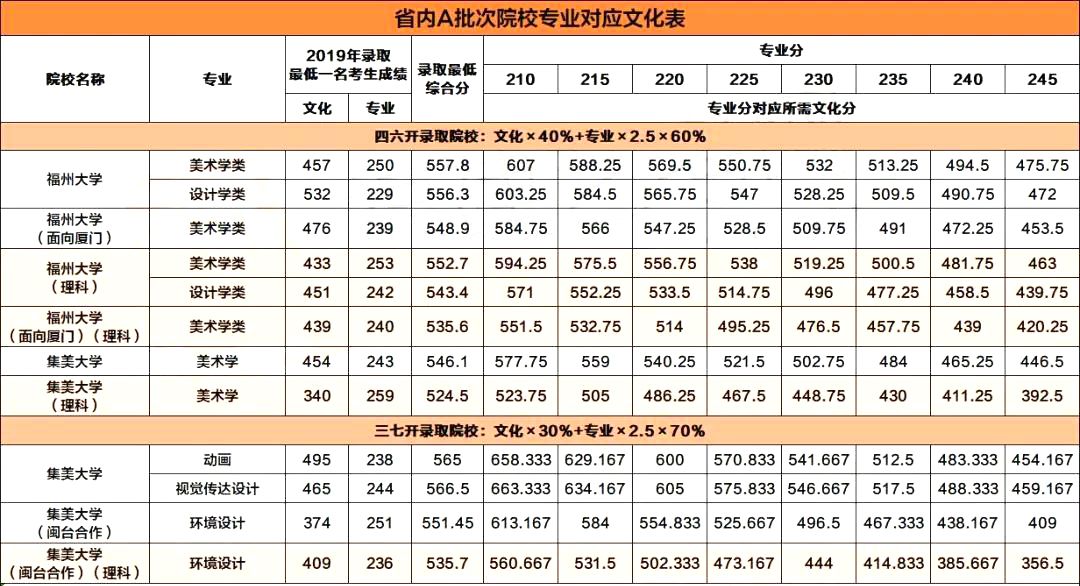 那么按照综合分录取院校我的专业和文化需要多少能上呢?集美大学、福州大学(厦工艺)应该都是省内热门院校,可以看看下表专业对应文化表。如果想冲刺福州大学设计学类,那么你的综合分至少达到去年录取最低总分分556.3分。旁边就是专业对应文化分了,如果我专业230,文化就需要528.25;如果专业235,文化就需要509.5,以此类推。
