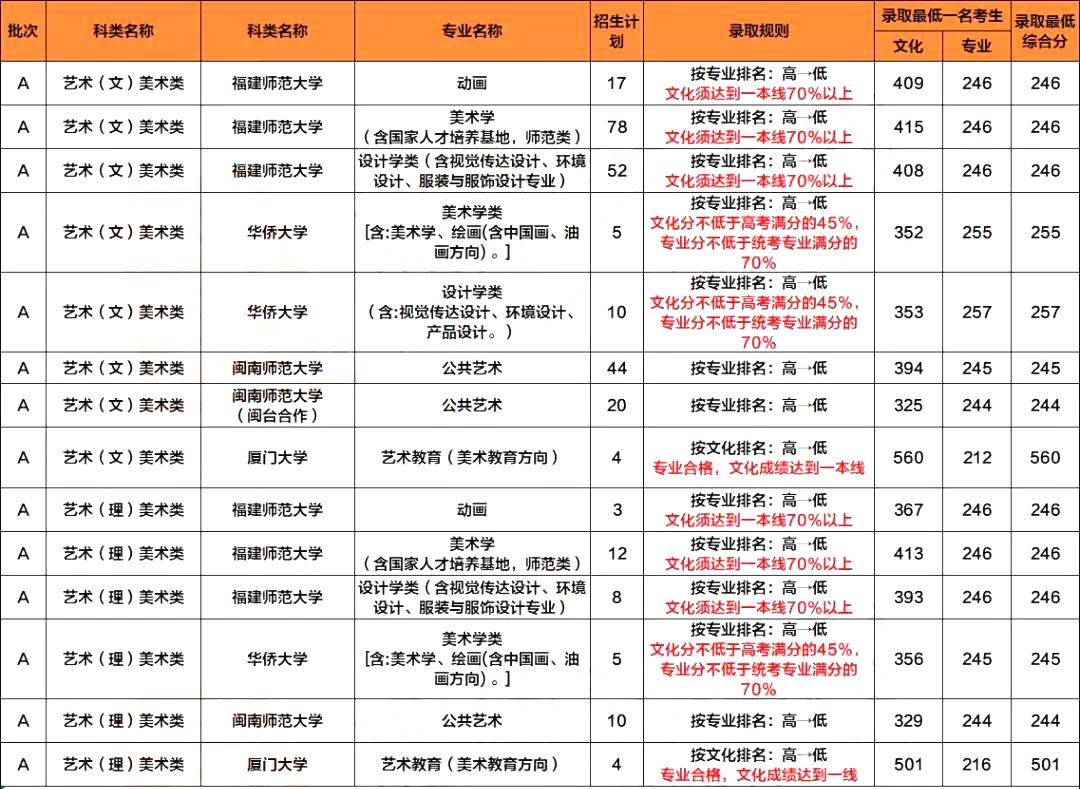 在这些按照专业、文化成绩录取的院校中,文化分要求过本科线或文化达到一定控制线才能投档,比如厦门大学艺术教育这个专业直接按照文化成绩录取,专业合格就可以了,那么去年录取的最低文化文科560,理科501。