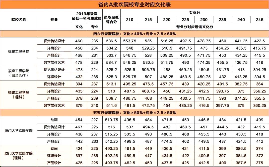 在给大家举个例子,福建工程学院、厦门大学嘉庚学院应该是在A批次院校中录取成绩较后面的院校,如果想录取福建工程学院视觉传达设计专业,那么你的综合分至少达到去年录取最低综合分536.5分,如果联考专业220,文化则需516.25;专业230,文化则需478.75;专业240,文化则需441.25。厦门大学嘉庚学院也于此类推。