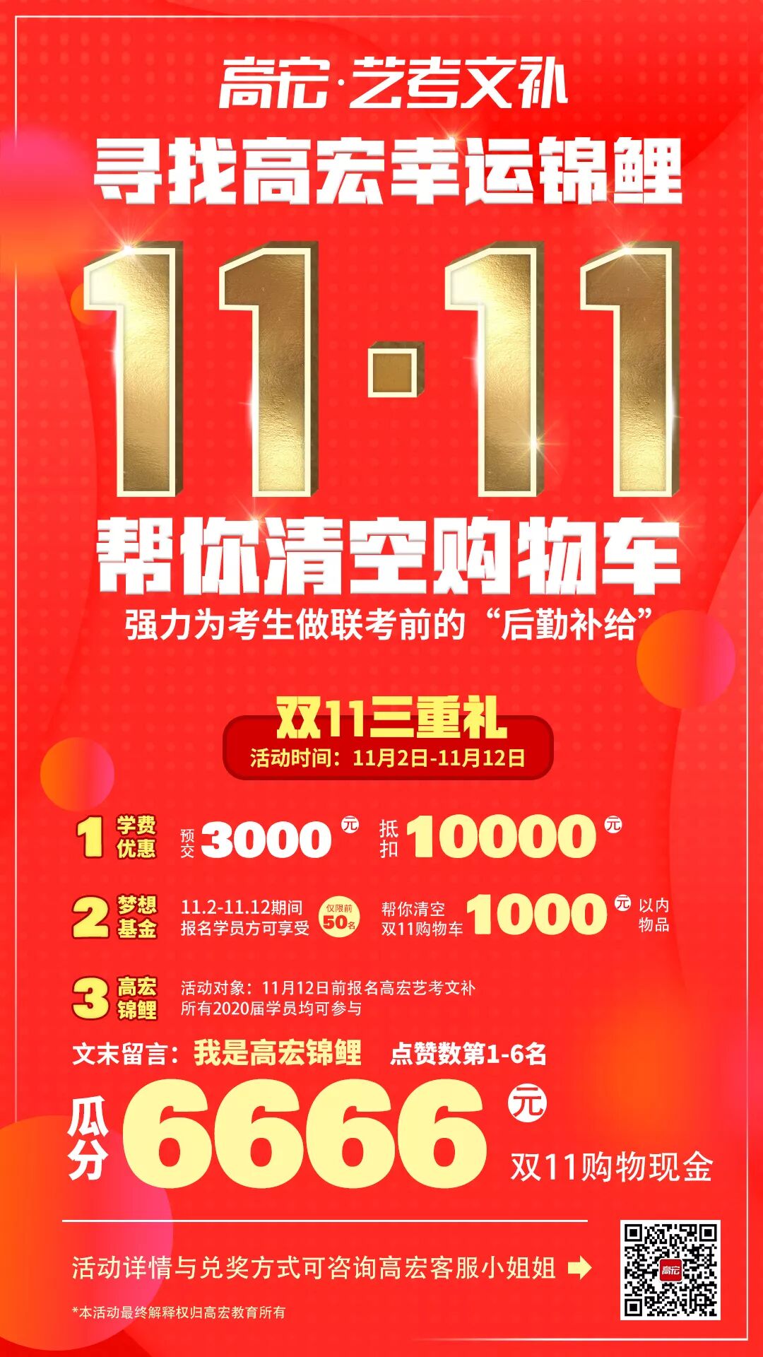 当然啦,11月12日前报名高宏艺考文补的所有同学,均有机会成为最幸运的高宏锦鲤!