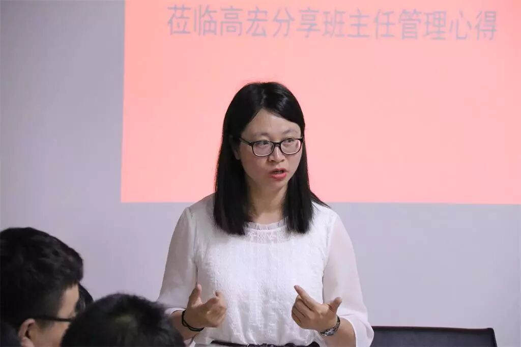 会上,吴剑琴老师通过“精细化管理”与“人性化管理”为高宏的班主任老师们分享了她的宝贵经验,特别指出要注重日常管理上的细节之处,尊重学生,了解学生,多发现学生们的优点加以表扬,增强同学们的学习信心,保持良好的师生关系。同时应注重家校沟通,每个班建立微信群,及时通报孩子的学习情况,定期给予家长电话回访,让家长更放心。