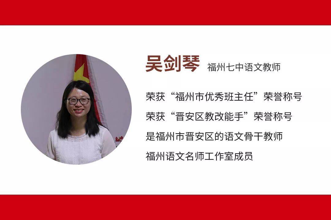 吴剑琴老师现任福州七中语文教师,获得过“福州市优秀班主任”、“晋安区教改能手”等荣誉,是福州市晋安区的语文骨干教师,语文名师工作室成员。在德育工作上,她依托学习共同体模式,开创了班级反思会、班级道歉日、家长微课堂等一系列颇具特色的班级主题活动形式。她坚持家校共育,注重推动家校间的互信合作,开设的省级、区级主题班会观摩课,得到了家长和同行的一致好评。
