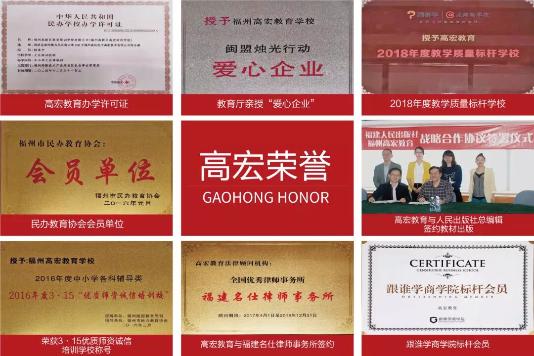 高宏教育是经教育局批准成立的正规教育培训机构,始终秉承“用心做教育”的纯粹理念,执行“在喜悦中追求卓越”的教育思想。现福州已有三大校区:鼓楼东街口校区、大学城校区、台江校区,合计面积50000多平米(另:南昌校区筹备中),现有全职教职人员近300名,办学多年,办学成效获得家长与学生的广泛认同,每年培训2000名中、高考全日制学员(含艺术文化课、高考复读班、中高考全日制等)。