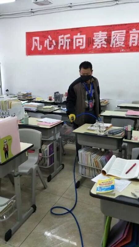 消毒场所涵盖了教室、办公室、宿舍、走廊、楼道、厕所、食堂、大厅等,采取喷洒与拖洗相结合。同时对各教室卫生进行了清理和通风,使校区更加整洁、明亮、舒心,给学员们提供了安全、卫生的学习环境,让家长放心。